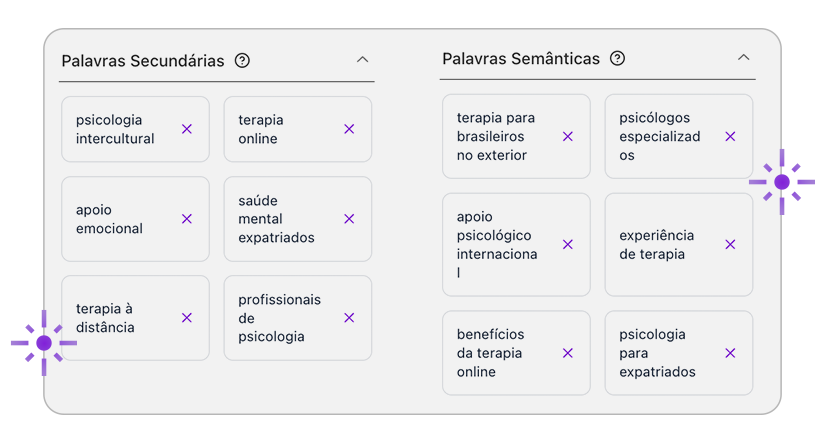 Palavras-chave secundárias e semânticas: a ferramenta analisa o termo, o objetivo do seu conteúdo e os concorrentes, e sugere as 15 melhores palavras-chave secundárias e semânticas para o seu texto.