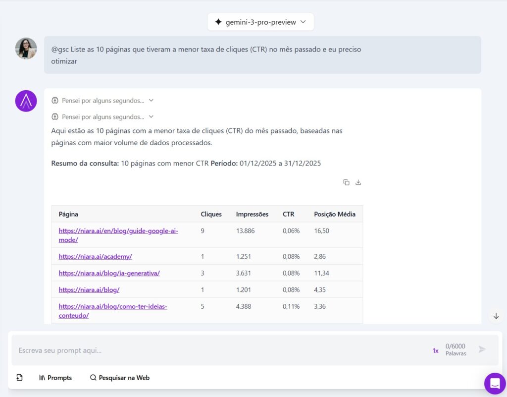 Em vez de “alertar” automaticamente, a Niara permite que o profissional descubra os problemas de forma ativa, perguntando diretamente ao Search Console coisas como: quais páginas estão perdendo visibilidade, quais termos caíram de posição, ou quais URLs têm bom posicionamento médio, mas estão subaproveitadas em cliques. Isso elimina a dependência de monitoramento manual contínuo e transforma a análise em um processo investigativo guiado por perguntas.