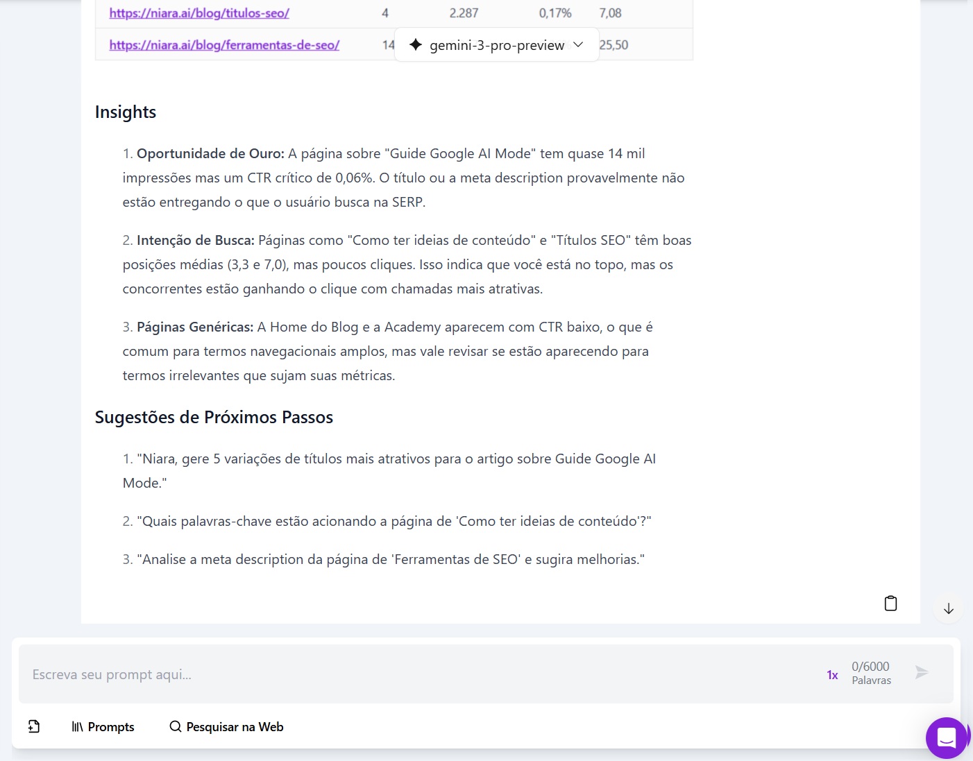 Em vez de gerar listas genéricas de “100 oportunidades”, a Niara orienta o foco para o que realmente importa naquele momento, com base nos sinais reais do Search Console. Logo abaixo dos dados informados pela Niara, você verá insights (análise) e uma lista de sugestões de otimizações que você pode realizar.