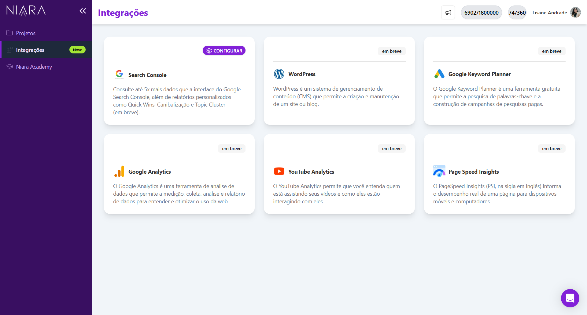 Nos próximos meses, vamos integrar a Niara ao Google Analytics, Keyword Planner, YouTube Analytics, WordPress, entre outras ferramentas.