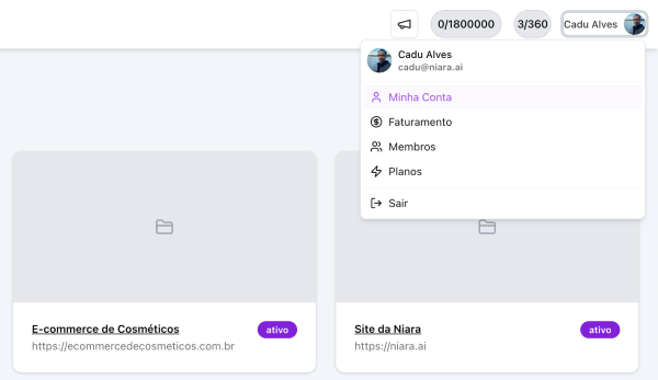 📌 Com esta alteração em Projetos, as informações de Minha Conta, Faturamento, Membro e Planos agora estão dentro do seu perfil. Basta clicar em sua foto, no topo à direita.