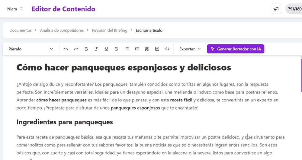 O que era bom ficou ainda melhor! Agora, após gerar o briefing, você encontrará um novo botão no Editor de Conteúdo: “Gerar rascunho com IA”. Com apenas um clique, a Niara gera um artigo completo e totalmente otimizado, baseado em cada detalhe do seu briefing – desde o título, palavras-chave, heading tags e suas orientações, e também o público-alvo. Menos tempo escrevendo, mais tempo personalizando!
