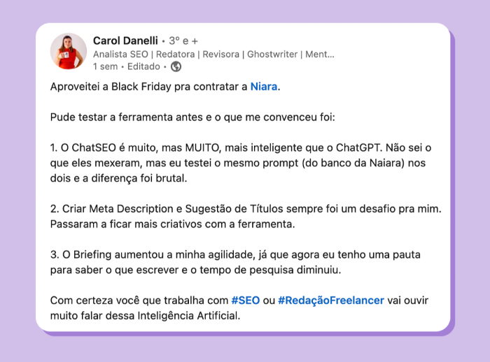 Seja qual for sua necessidade, faça o teste. Converse com a Niara, no ChatSEO e tenha um banco infinito de ideias e sugestões.