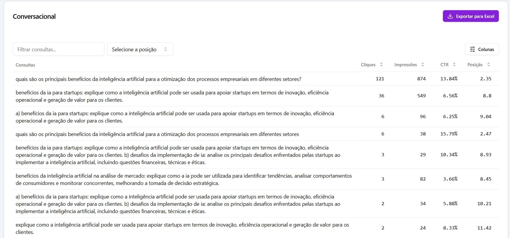 - Consultas Conversacionais: As pessoas já fazem perguntas extensas no Google. A Niara analisa até 25 mil consultas do seu GSC e informa as que possuem estilo conversacional: