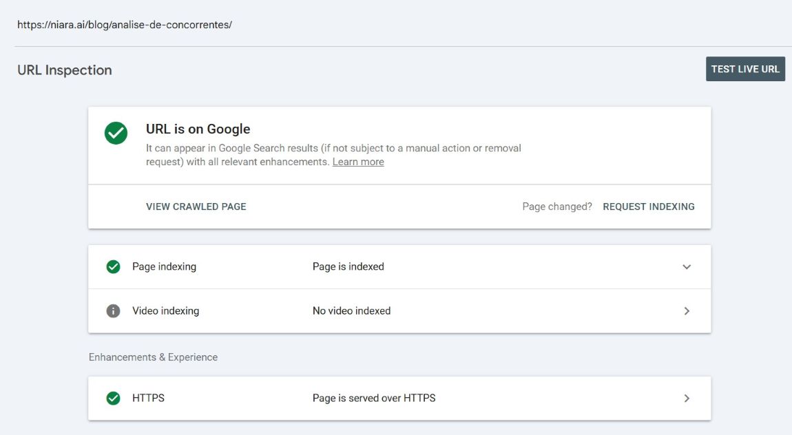 Resultado: Você usou o GSC para um diagnóstico técnico preciso e a Niara para executar a solução estratégica de conteúdo. Em poucos dias, sua página deverá ser indexada e começará a competir pelas posições que merece.