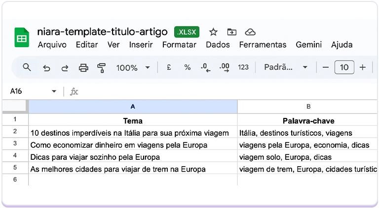 Informe o nome do arquivo, o idioma e escolha o tipo de conteúdo que gostaria de gerar. E baixe a planilha.