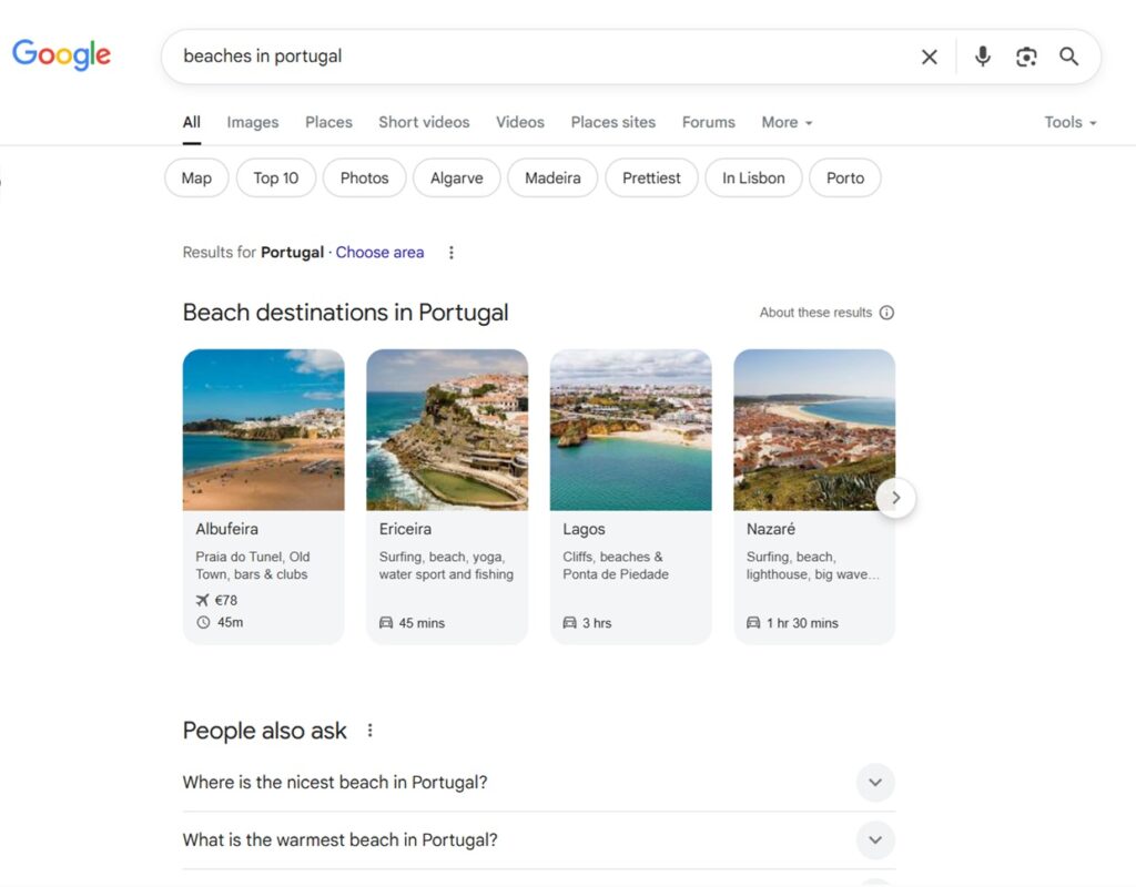 The query “beaches in Portugal” is a perfect example. The user’s intent is visual and exploratory. They want to see photos, get options, and maybe even a map. Google understands that a text summary, no matter how hard it tries to list the beaches, does not satisfy this intent. The user needs a visual and exploratory experience, something that a travel site, with photo galleries and maps, can offer in a superior way.