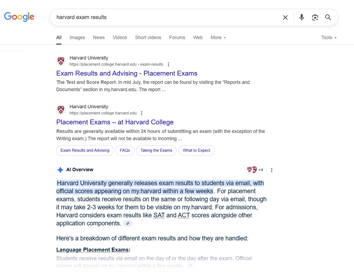 Searches with mixed intent: In the case of a search for “harvard exam results,” the user’s primary intent is transactional: they want to know their score. However, Google does not have access to this personal information. Recognizing this limitation, the AI system understands that the next best thing to do is to answer a secondary, informational intent: how they can obtain that score. Therefore, it first displays the answer from a site with strong authority that can guide the user. Then, it tries to answer the user’s main questions with a Query Fan-Out, breaking down the query into “how to view the score,” “how the score can be used,” etc. The AI is smart enough to know that the best answer for the initial intent cannot be provided by it.