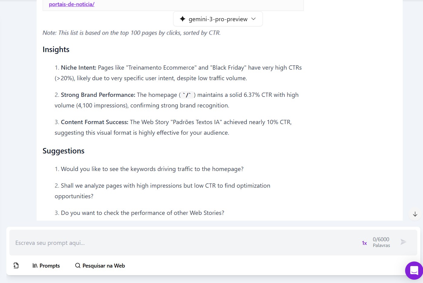 Instead of automatically “alerting” you, Niara allows the professional to actively discover problems by directly asking Search Console things like: which pages are losing visibility?, which terms dropped in position?, or which URLs have good average positioning but are underutilized in clicks? This eliminates reliance on continuous manual monitoring and transforms analysis into an investigative process guided by questions.