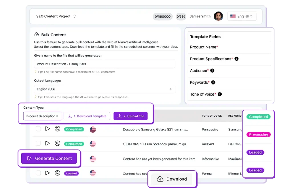 - Batch titles, meta descriptions, and product descriptions.