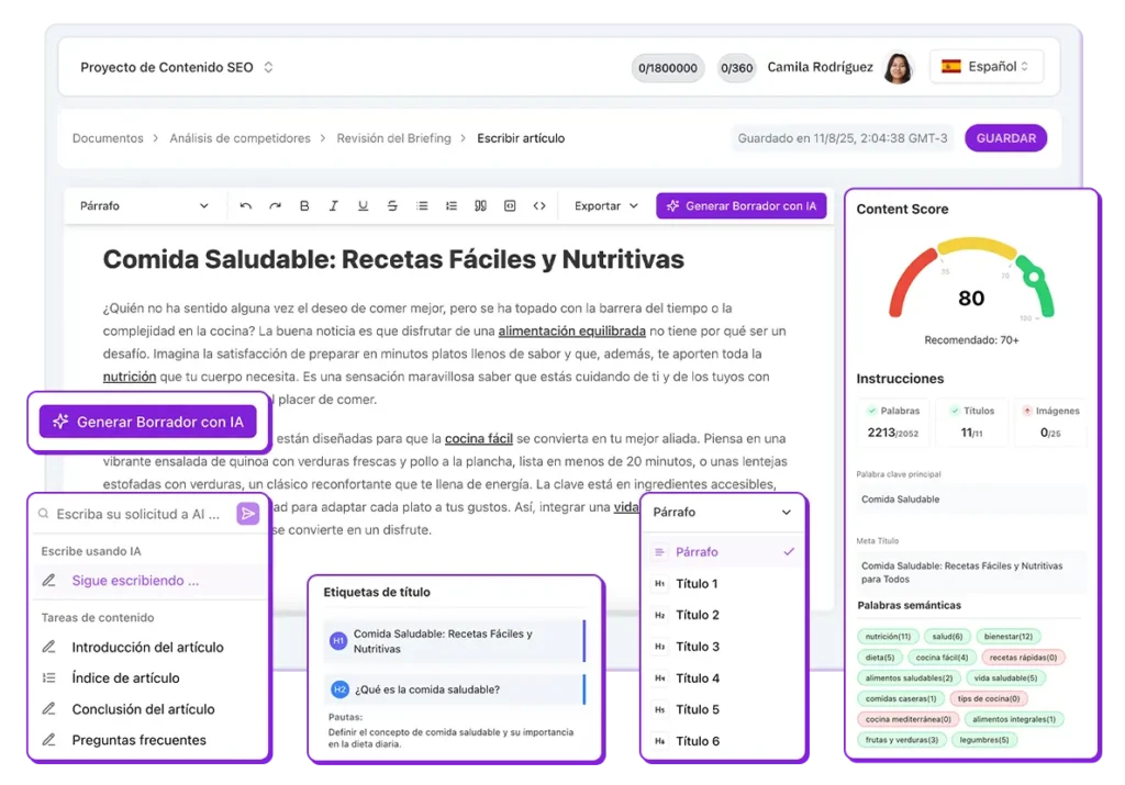 Análisis de datos de las SERP y de los competidores incluso antes de escribir la primera línea, garantizando que el contenido nazca ya optimizado.