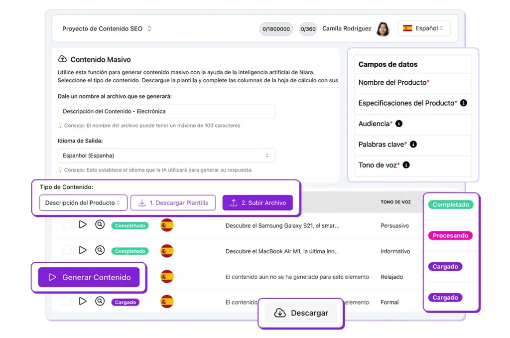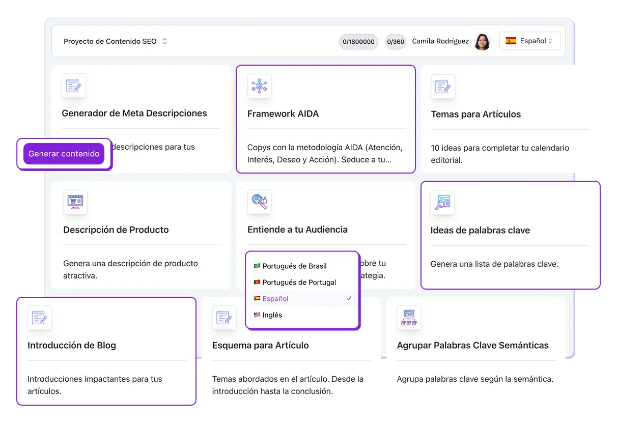 Genera cientos de descripciones de productos y artículos optimizados en minutos.