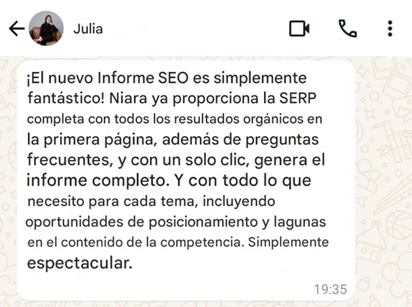 Al mes, el equipo crea más de 100 briefs y tardaba unas 100 horas solo en esta tarea. Hoy, con Niara, el equipo dedica 30 horas al mes. De casi 1 mes a menos de 1 semana de trabajo. Niara recopila todos los datos de los competidores y da una visión clara. ¡Es sensacional!