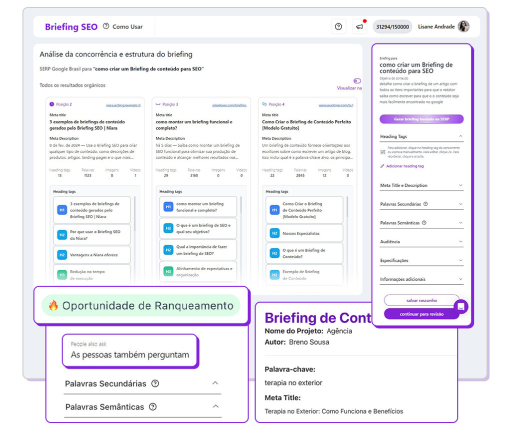 Briefing SEO: Exibimos as informações da SERP do Google e dos concorrentes orgânicos, em tempo real e lado a lado.